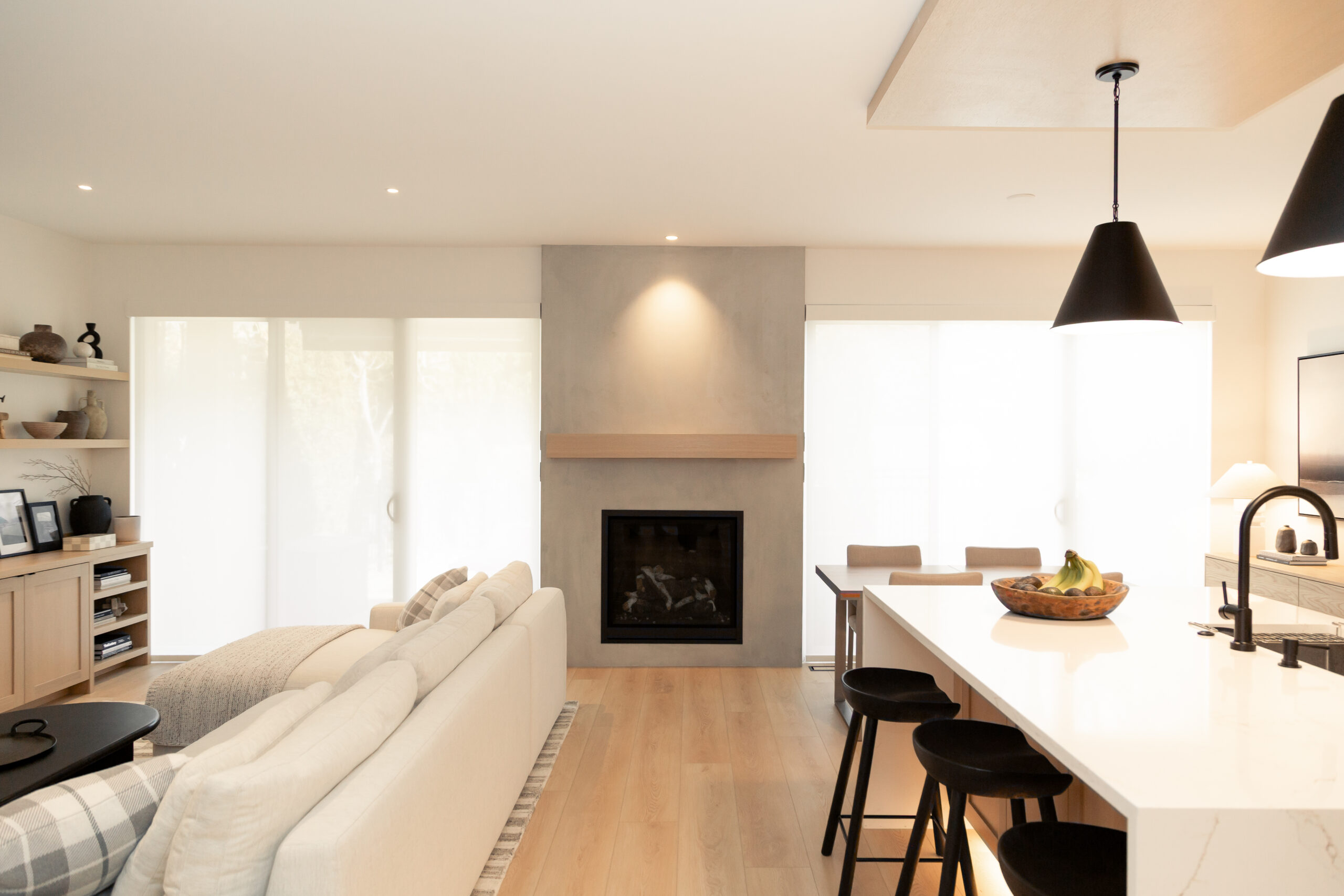 Bright, Airy Main Living Space – Large windows and a softened colour palette create an inviting, light-filled environment throughout the open-concept layout.